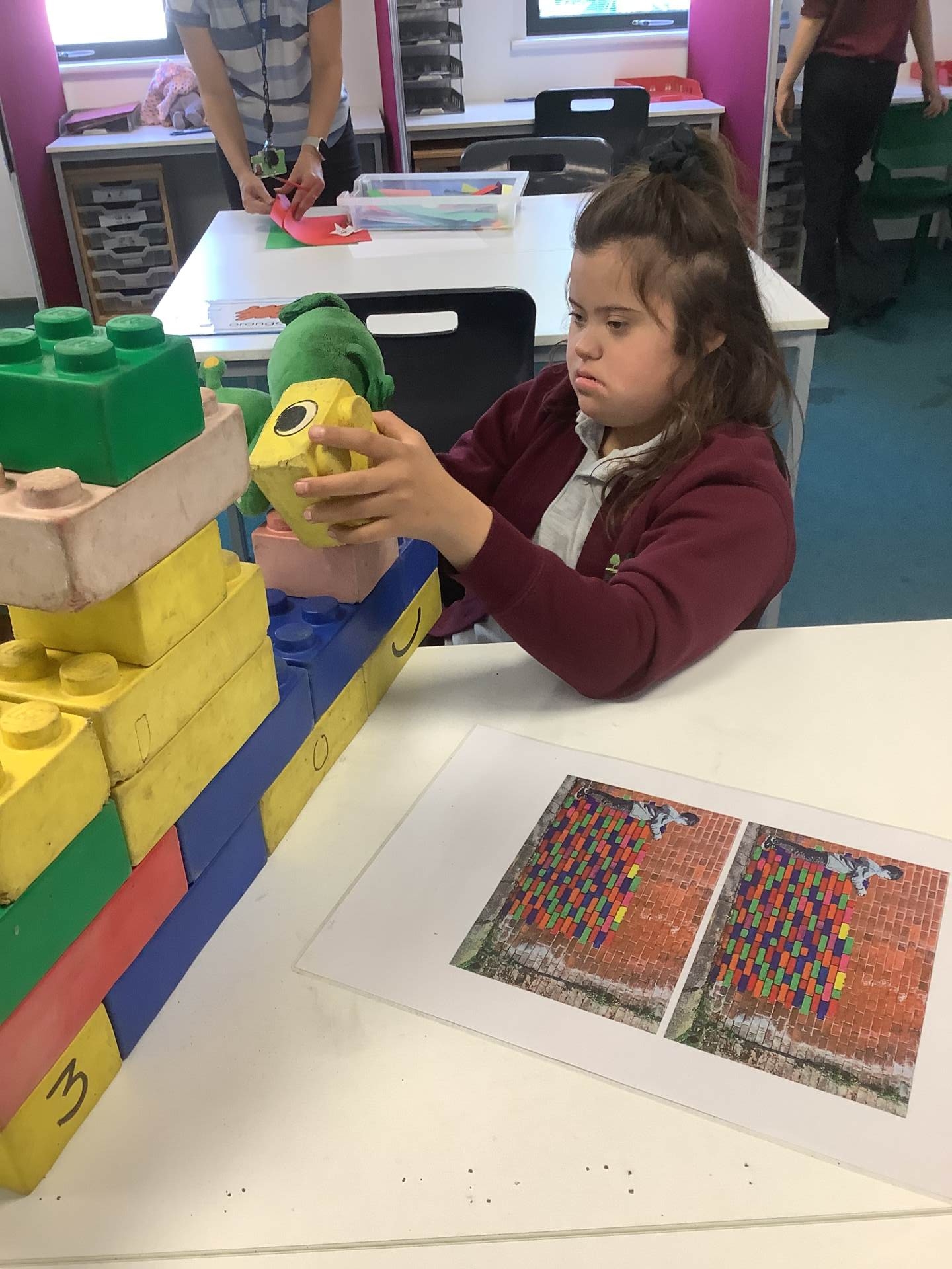 We explore different texts through sensory stories and interactive experiences. This term we have be reading and writing about what people do all day. This term we have been looking at a local artist ‘Hendog’ and recreating his brick pictures.